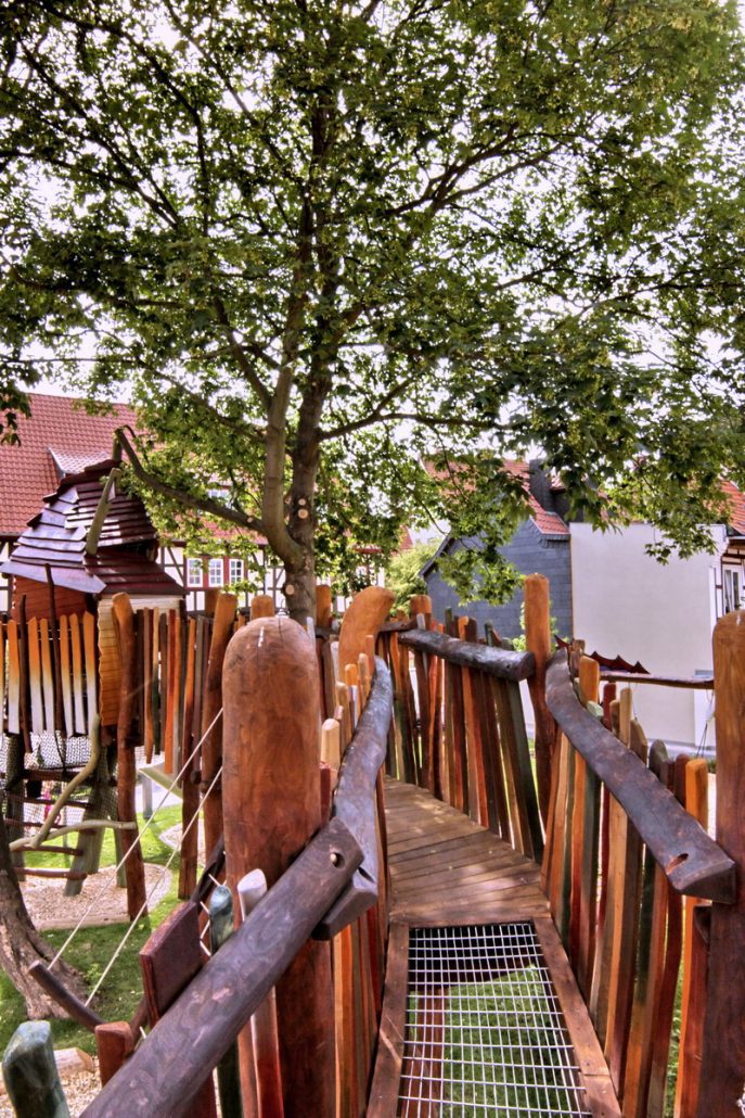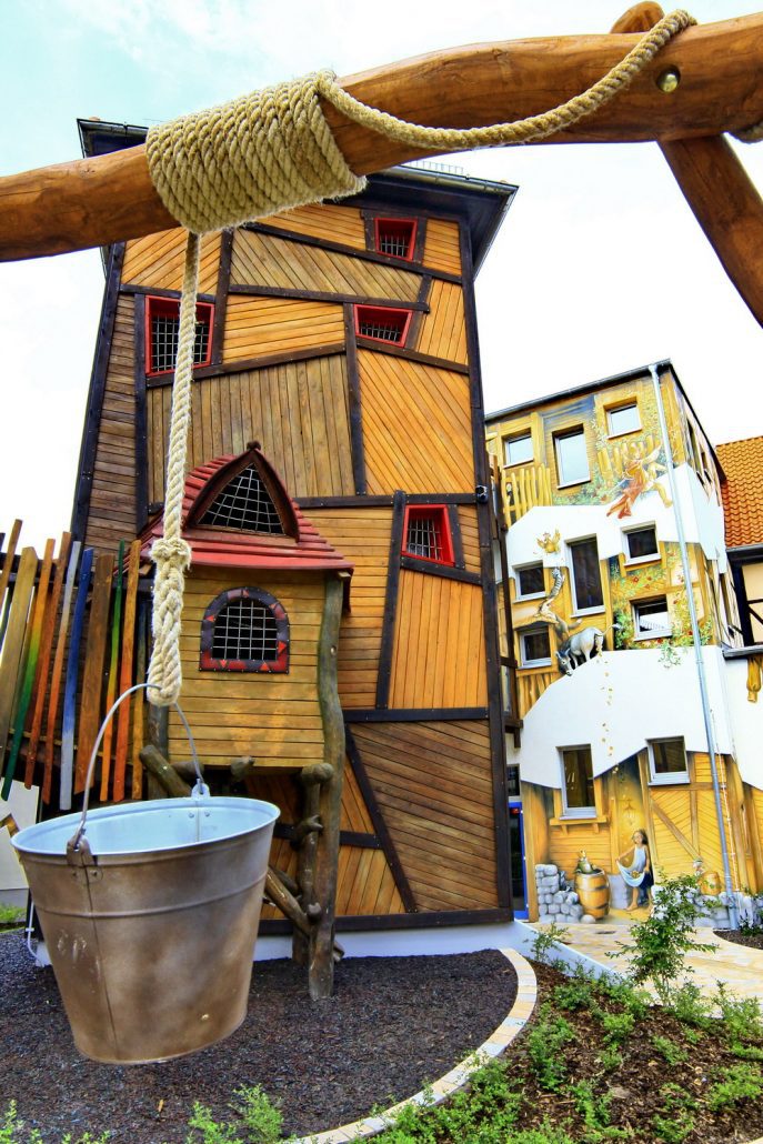 Als Müller und Bäcker können sich die Kinder in dem groß angelegten Sand-Matschbereich ausprobieren. Nebendran sind vielfältige bekletterbare Türme, ein Wasserwerk und Wasserrinnen angelegt. Im großen Baumhaus mit Steg zum Turm befinden sich nicht nur eine Hexenküche mit „Backofen“, sondern die verschiedensten Kletterröhren, Kletternetze und sogar ein Fernrohr mit Blick ins Weite.