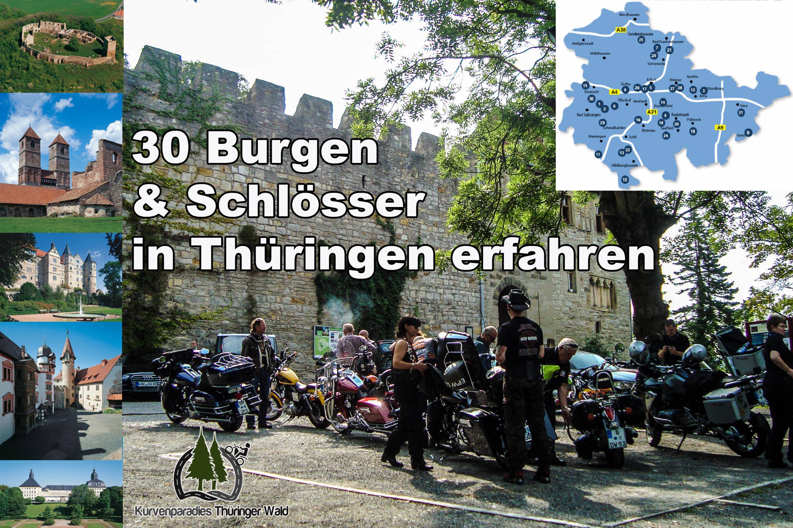Einige der schönsten Bergpässe wie, Inselsbergstraße, Schmücke, Rhön & westlicher Thüringer Wald und das Drei Gleichen – Burgenensemble, befinden sich mitten im Kurvenparadies.