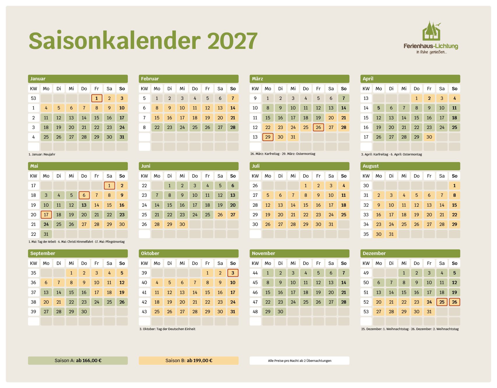 Der Wald erscheint zu jeder Jahreszeit völlig anders. Das Jahr im Überblick im Saisonkalender hilft Ihnen, die perfekte Reisezeit zu finden. Bei uns können Sie jede Zeit ausgiebig genießen. Unsere Preise für Ihr Ferienhaus unterscheiden sich in zwei Saisonzeiten und gelten pro Haus und pro Nacht.