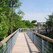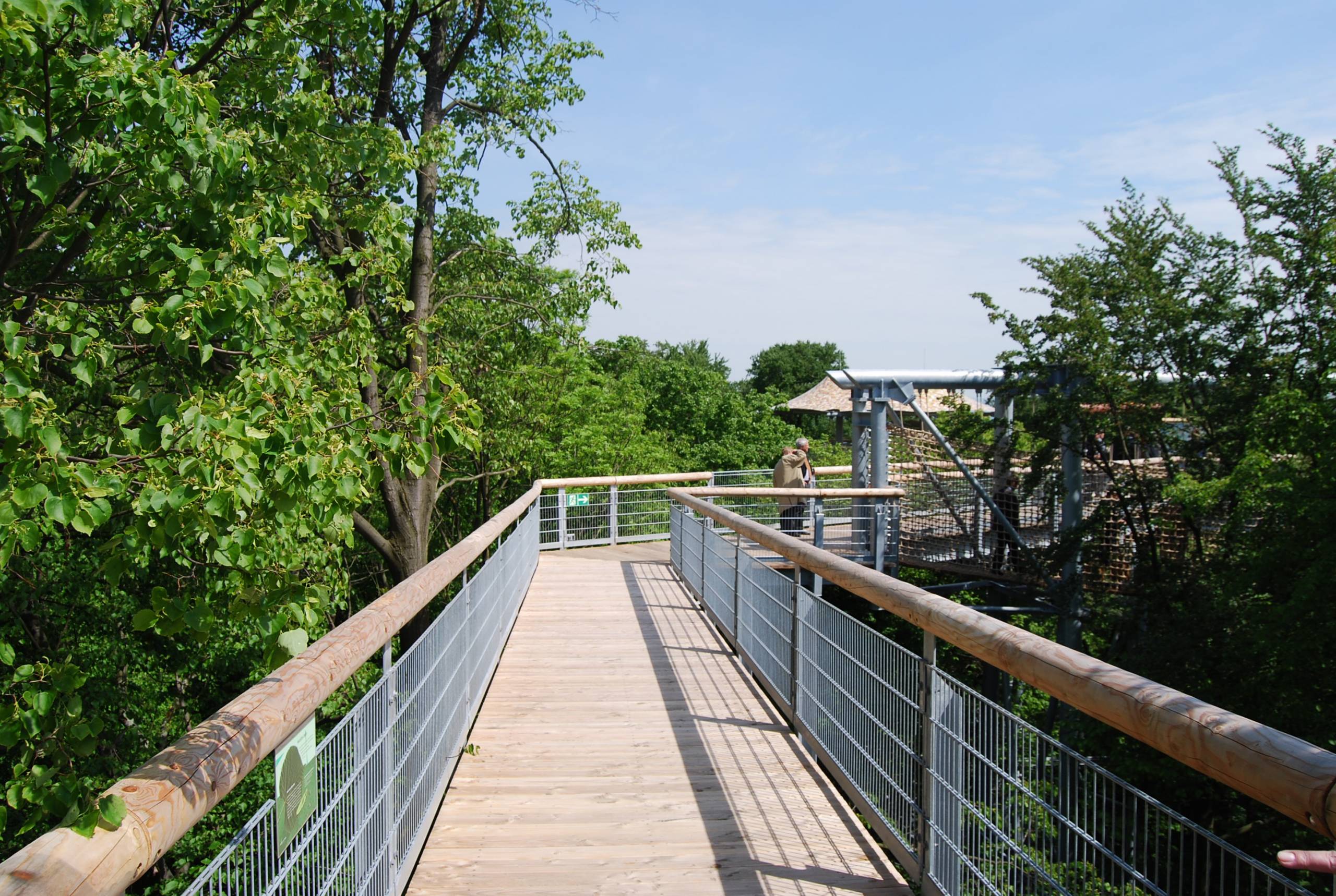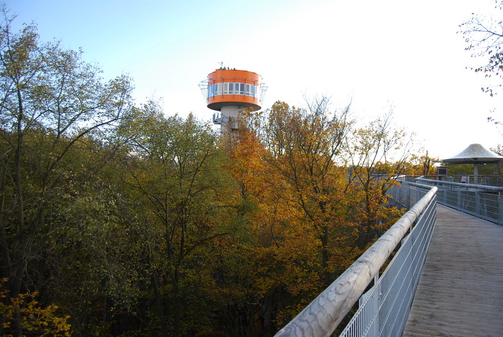 Auf einem 500 Meter langen, geschlängeltem Weg gelangen Sie bei gemächlichem Anstieg über einen breiten Holzpfad und Metalltreppen von Null auf 40 Meter Höhe durch die Baumkronen unter kühlenden Blätterdächern bis auf diesen orange leuchtenden Turm, von dem Sie in die ganze Welt schauen können. Sie glauben es nicht? Ganz oben angekommen werden Sie meine Behauptung bestätigen. Seien Sie gespannt! Auch Ihre Kinder und Enkel werden mit Freude ihre Geschicklichkeit und ihren Mut ausprobieren. Eltern, Großeltern und andere wagehalsige Personen dürfen ebenfalls diese kleinen Abenteuer miterleben.